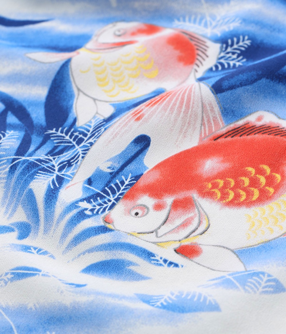 縮緬生地に鮮やかなカラーリングで描かれた金魚は、